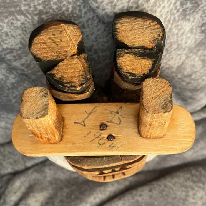 A skilful carved and painted man sitting on a bench and smoking his long pipe. Underneath signed “L.L” which is the initials of Lorens Larsson and dated 1941 (indistinct). Size: bench 3 inches wide and total height 4.5 inches high. Very good condition with a lovely worned patina and slightly faded colors on backside.